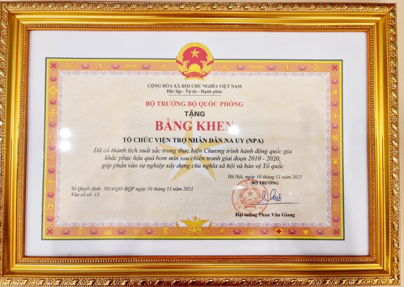 Norwegian People's Aid in Vietnam is very proud to be the only non-governmental organization to receive the Certificate of Merit from the Government of Vietnam for excellence in mine action during the last 10 years. NPA received this honor during the Vietnam national conference held on 17 February 2022, for review on the national mine action program 2010-2020 period and mission orientation for 2021-2025 period.